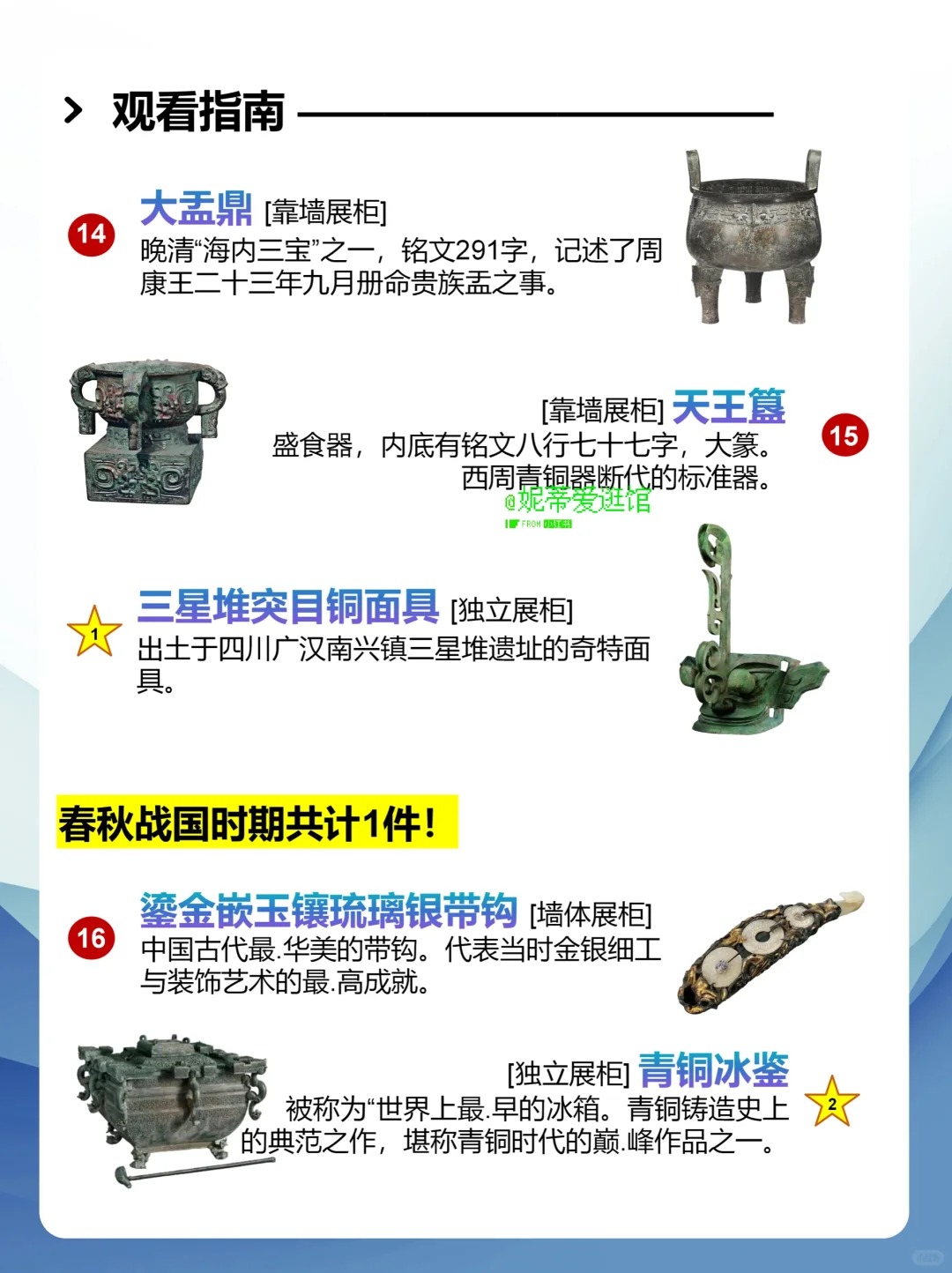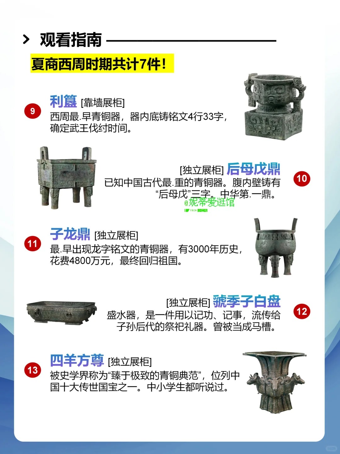 | 后母戊鼎 | 中间独立展柜,显眼好找 | 商代晚期/青铜/河南安阳 |
