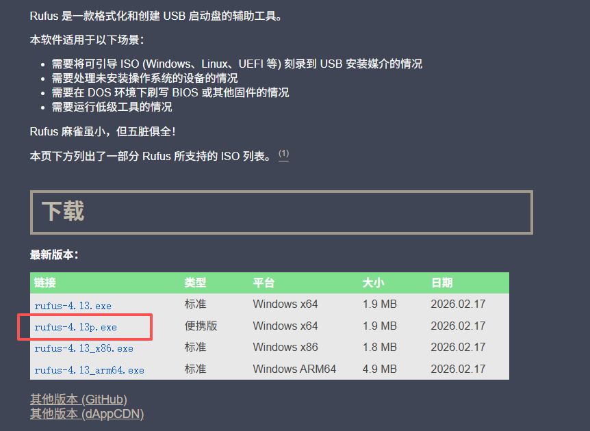 前往 Rufus 官网 下载便携版(免安装)。