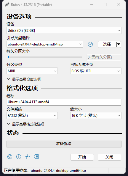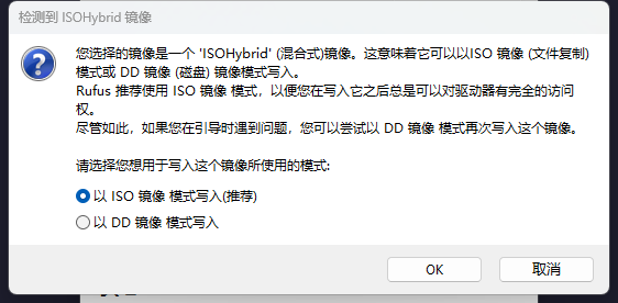 点击底部的 “开始”。如果中途弹出提示框询问写入模式,选择 “以 ISO 镜像模式写入 (推荐)”。