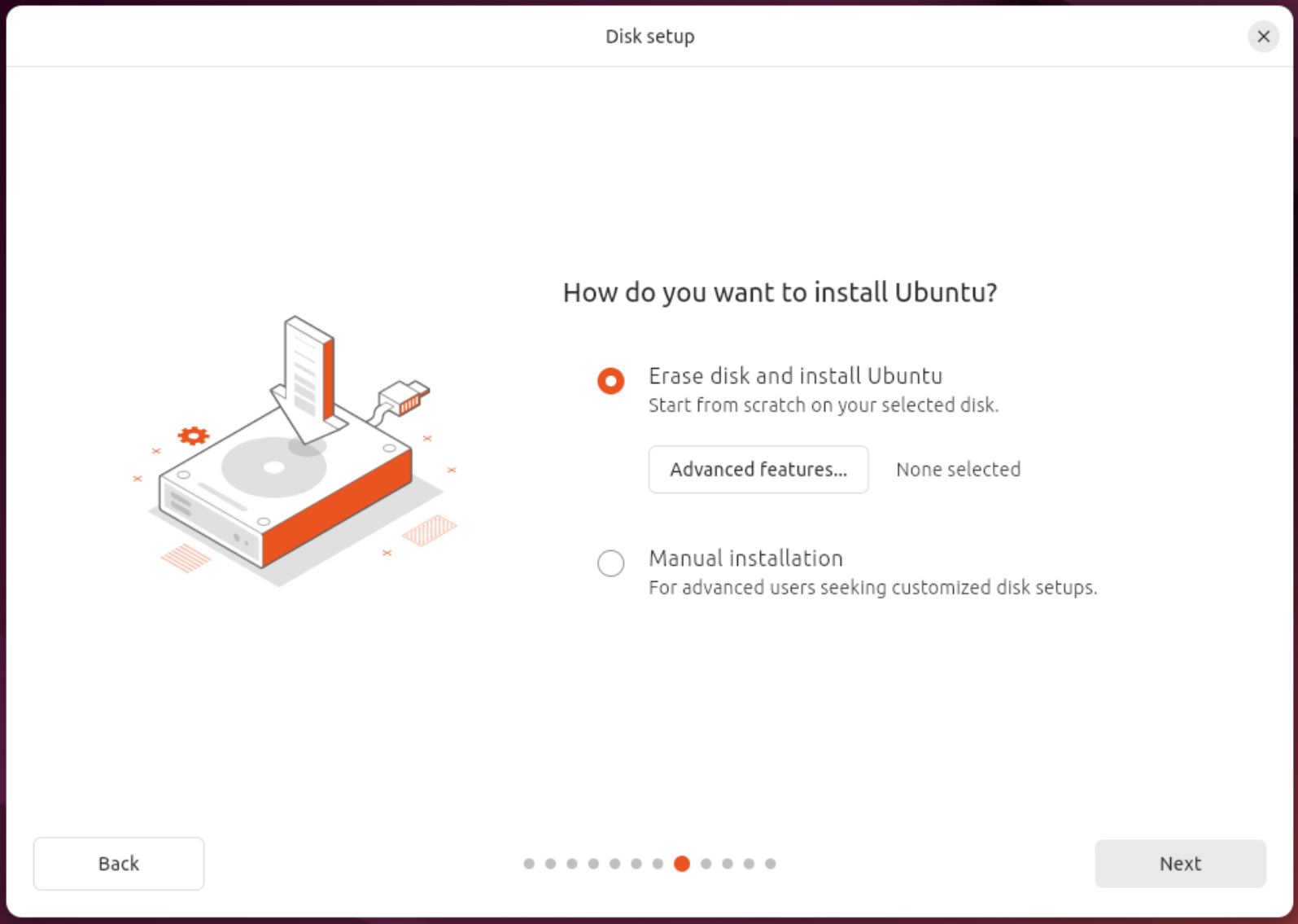- 清除整个磁盘并安装 Ubuntu:推荐。系统会自动格式化磁盘并分配空间。警告:此操作会清除硬盘上的所有数据,请确保已备份。