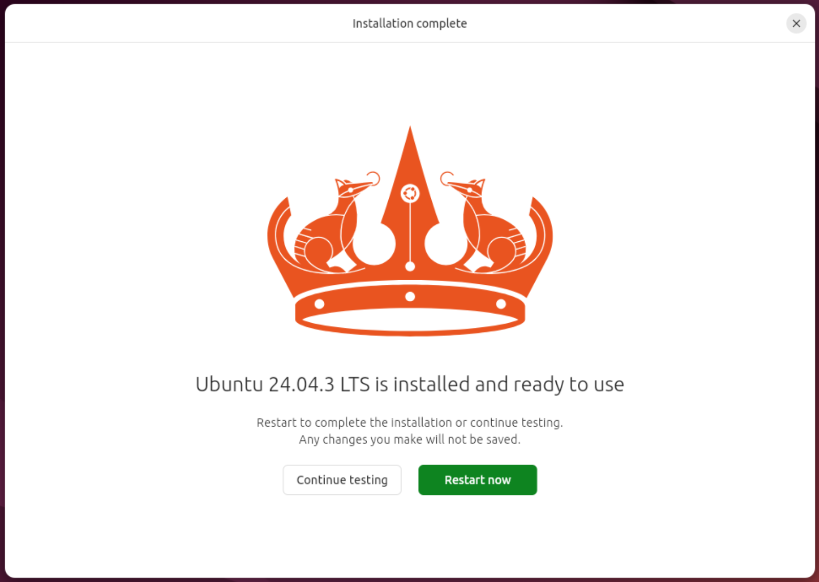 现在重启(Restart now),并在屏幕提示时拔出 U 盘,最后按回车键。重启后即可登录到 Ubuntu 桌面环境